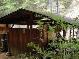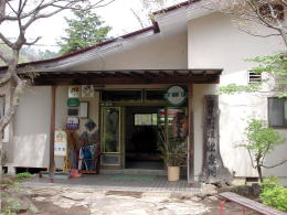 駐車場から約15分で宿の玄関に到着。荷物をケーブルに乗せていた宿の人がいたので(宿泊客の荷物はケーブルで駐車場まで運ぶ)、立ち寄り湯に来たことを告げると、フロントに缶があるので500円入れて勝手に入ってくださいとのこと。アバウトです。 |