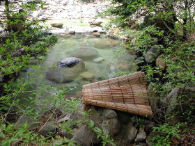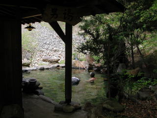 木戸の分岐点から谷底に向かって下ると眼下にお目当ての露天風呂が見えてきた。