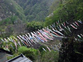 標高1200メートルの草津の温泉街から700mの旧六合村の集落まで国道292号の旧道を一気に下ると鯉のぼりの大群がお出迎え。