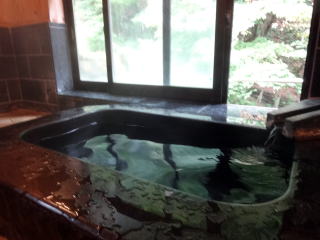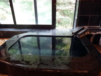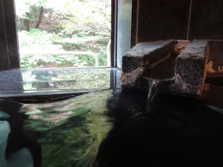 | 理由はすぐにわかりました。おそらく川辺から自然湧出する湯をそのまま湯舟にかけ流すためでしょう。源泉温度は45.2℃。二人は入れば満員御礼の湯舟に絶え間なくかけ流されているので43℃くらいはあるでしょうか。やや熱めの湯ですが、名湯・四万温泉らしい柔らかな肌触りです。 |
