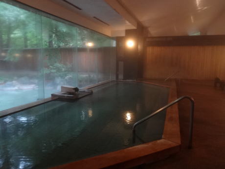 湯舟の向こうは全面ガラス張りで露天風呂と木々の緑を眺めながら入れる大きな内湯。