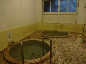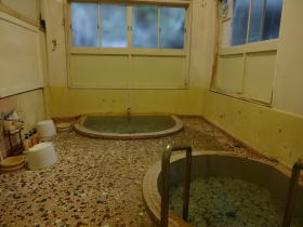2つある「山荘の湯」は左右対称の相似形。湯舟と床はタイル張り。全体的にかなりくたびれた感はありますが、不思議に心落ち着く浴場です。