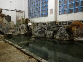 入口は男女別々ですが、脱衣所から浴室に行くと中は渋い岩風呂がひとつ。湯舟は岩で2つに仕切られていて湯口に近いか遠いかで温度差をつけています。