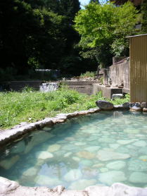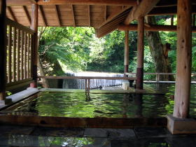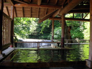 | 四万たむらと聞いてまず思い浮かべるのがこの露天風呂ではないでしょうか。宿の玄関から一番奥にある浴場で、我々夫婦も真っ先にここへ向かいました。 |