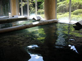 | 毎分1600〜1800リットルという圧倒的な湯量の自家源泉を持つだけあって、丸太で仕切られた大きな湯舟に、四万ならではの肌を包み込むような柔らかい湯がかけ流されています。 |