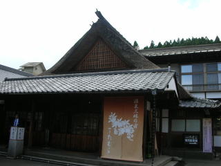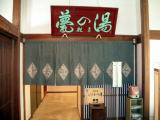 | 長い歴史を持つ老舗旅館だけあって、玄関は堂々たる風格の茅葺き入母屋造りで、気後れしそう。それもそのはず、今回は外来入浴1680円のところを雑誌『自遊人』付録の温泉パスポートを利用して(しかも夫婦そろって)ただで入れてもらおうというのです。 |