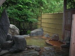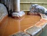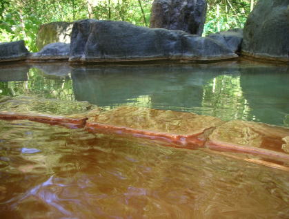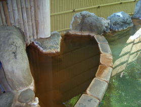 | 体が温まったところで源泉浴槽へ。日本では数少ない炭酸泉を源泉かけ流しで味わえる貴重な湯舟。手持ちのガイドブックの写真にはこの浴槽はないのでわりと最近設置されたようです。酸化して赤茶色に濁っています。源泉温度は14℃弱だそうですが、真夏なので20℃くらいになっていると感じました。湯口に細いパイプが2本あって、その一方から透明な源泉がたらたらと流れています。説明書きには冬場は加温した湯も投入すると書いてあるので、もう一方のパイプは加温用でしょう。 |