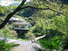 右の写真は駐車場付近から宿を見たところ。橋を渡って玄関へと向かいます。 |