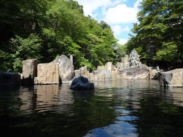 | 左は混浴の「般若の湯」(50畳)。この他に対岸に混浴の「子宝の湯」(200畳)、最奥には女性専用の「摩耶の湯」(100畳)があり、まさしく日本最大級の露天風呂です。 |