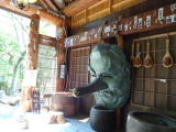 | 食堂や売店の中を抜けると、「民具資料館」という名の古い道具がごちゃごちゃ置かれた長い通路があり、そこを出ると折の中に熊がいます。昭和25年頃、親を失い、宿の主人が育てていた2頭の小熊が温泉に浸かるようになり、それがマスコミで取り上げられて宝川温泉は一躍有名になりました。 |