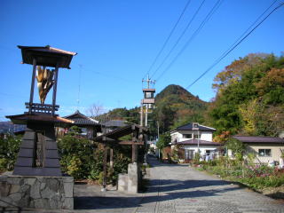 | かく言う私も「相当意識していた」にも関わらず通り過ぎ、あわててUターン。目印は「湯けむりの塔」(写真)。すぐ左側は国道17号線です。 |