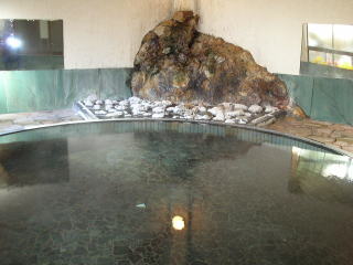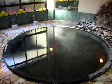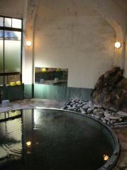 | 大浴場は混浴(他に婦人風呂あり)。脱衣所が男女に分かれていないので、女性は利用しづらいです。両側に洗い場のある円形の湯舟は見た目、美しいのですが、どうしても向かい合って入ることになり、やはり女性にとっては入りづらいでしょう。訪れたときはたまたま他に誰もいませんでしたが、貸し切りではないので妻は落ち着かないらしく、早々に上がりました。着替え終わると宿泊の男性が入ってきて危ういタイミングでした(笑)。 |