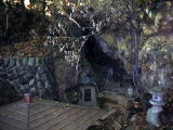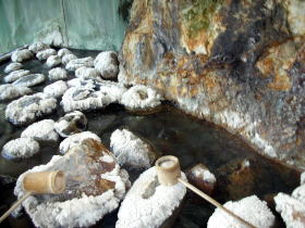 | わざわざ浴室に巨岩を残しているところを見ると、ここも泉源のひとつなのでしょうか。周りの石には温泉成分がフジツボのように固まっています。柄杓が置いてあるので飲んでみました。硫黄分も感じさせる味。熱いから注意しましょう。 |