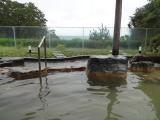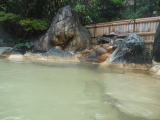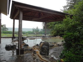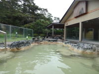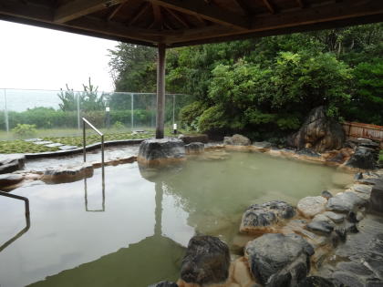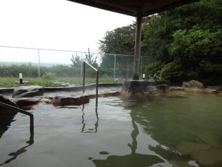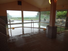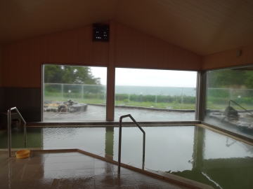 | 広い浴室に広い湯舟、堂々たる内湯です。感動しました。大きな窓からは2つの露天風呂とその向こうに太平洋が見えます。昆布茶色とでも表現したらいいでしょうか。やや熱めの湯がかけ流されています。素晴らしい湯です。 |