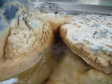泉質はナトリウム・カルシウム-塩化物温泉。舐めてみると想像どおりのちょうどいい塩味。湯舟の周りには温泉成分がいい感じに付着しています。