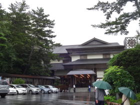 | 下の写真右が六角堂、左が六角堂から見た別館大観荘です。駐車場に車をつけるとたまたま送迎バスから降りてきた女性従業員が「いらっしゃいませ」と自分の傘を差しかけてくれました。 |