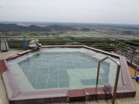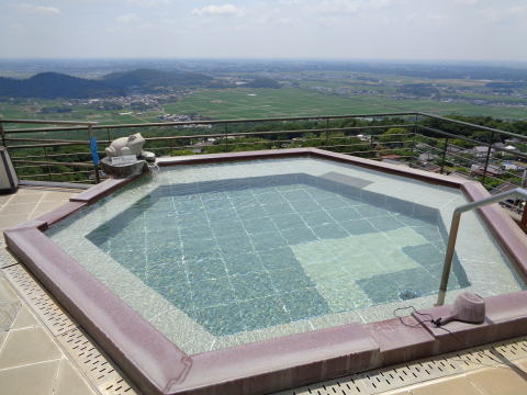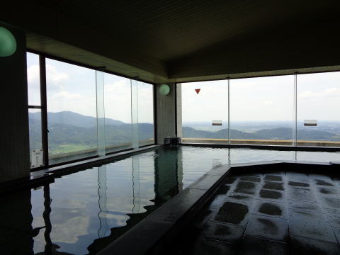 | 「雲上の湯」というネーミングどおり、眼下に関東平野を一望できます。写真は男性用で女性用の湯舟は長方形をしています。どちらも10人ほどはゆったり浸かれそうです。 |