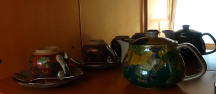 | カップやポットは九谷焼。どこまでも加賀に拘っているところがうれしい。タンスの中には「休足時間」(湿布薬)も入っていて至れり尽くせりです。 |