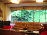破風造りの重厚な玄関を入ると赤い絨毯が敷き詰められた洋風のロビーがあります。その隣には畳敷きの談話室があって、「日本秘湯を守る会」の提灯が掛かっています。 |