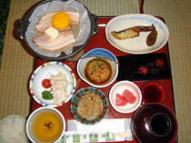 | 朝食も部屋でいただきます。夕食は量が多く、お腹がパンパンになってしまいましたが(せっかく出されたものを残すのが嫌いなもので)、朝食はほどよい分量。ご飯がとても美味しかったです。 |
