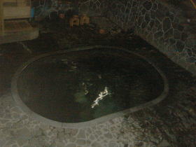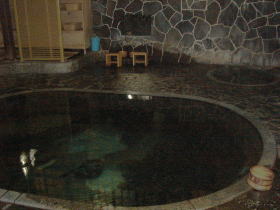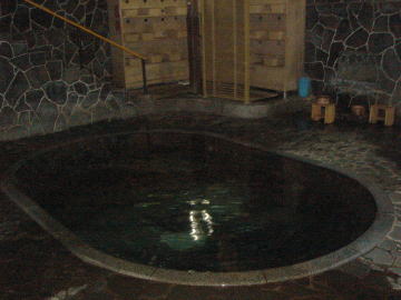 | 「日本一深い自噴天然岩風呂」だそうで、湯舟の深さは約125cm、当然立って入ります。立ち湯は全身に万遍なく湯圧がかかり循環器系を整え、血行促進にも効果があるとのこと。湯舟の縁から30cmほどの深さのところが踏み段のようになっているので、そこに腰かけることができます。 |