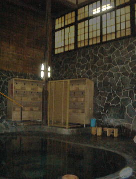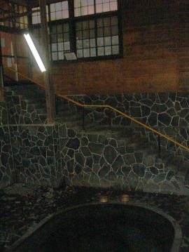 下からは2階を通り越して湯気抜きのある天井まで10m以上ありそう。何故このように深いところに湯舟があるのかというと、仲居さんの話では温泉発見以来数百年、自噴が弱まっては掘り、また弱まっては掘りするうちにこの深さにまでなったそうです。