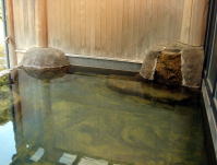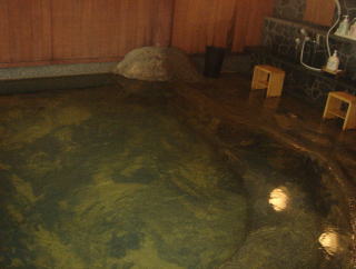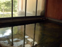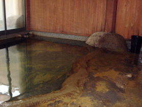 清潔感があり、落ち着いた、雰囲気の良い内湯です。湯舟は大岩をくり抜いて造ったような感じ。マーブル模様の湯舟にかけ流される湯は鉛色に透きとおっています。この色が「鉛温泉」の由縁でしょうか。