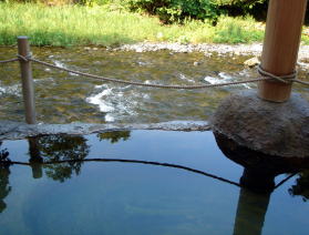 この浴場の湯は「下の湯」源泉(50.2℃、pH8.4)に「河鹿の湯」源泉(50.4℃、pH8.5)を10〜20%加えて温度調節しているとのことです。 |