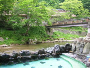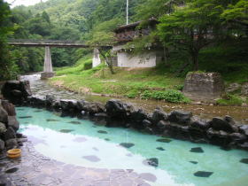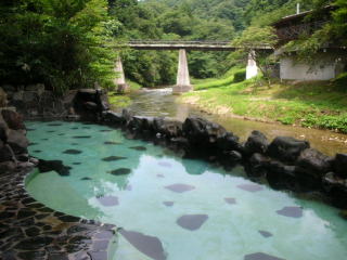 | 大沢温泉にはたくさんの浴場があるのでどこにしようかと迷うところですが、やはり何といっても混浴大露天風呂「大沢の湯」でしょう。大沢の湯は自炊部にあります。広い湯舟のすぐ隣は豊沢川の流れ・・・素晴らしい露天風呂です。 |