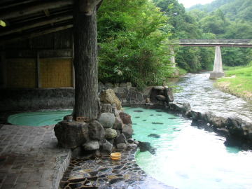 温泉雑誌などでよく目にするのはこのアングルだったでしょうか。誰もいないのをよいことに写真を撮っていたらしっかりアブに刺されました。私と入れ替わりに上がっていった年配の女性たちも「アブがうるさくてねえ」と言っていましたが、夏の露天風呂はアブが困りものです。