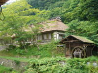 橋の向こうに見える茅葺き屋根の建物が菊水館。