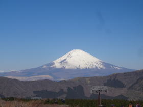 写真は駐車場から見た富士山。まさに日本晴れ! 左の裾野の彼方に南アルプスまで見えます。 |