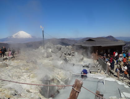 大涌谷は約3000年前に箱根火山の噴火により形成された崩壊地形で、現在でも噴気が活発に立ち上っています。