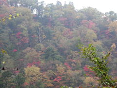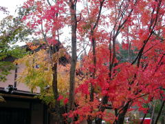 | 九酔渓を抜けたところで立ち寄った茶房のもみじが燃えるような赤 |
