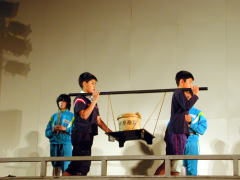 | 小学校3、4年くらいでしょうか。白丁(はくちょう)さんたちの練習にも熱が入ります。 |