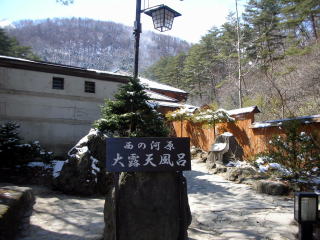 | 昭和62年のオープン当初は水着で入る混浴の露天風呂でしたが、現在は男女別に仕切られている(写真は男風呂、左の板塀の向こうが女風呂)。 |