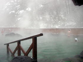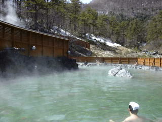 | とにかく広い。三方を山に囲まれ、冬の深雪、春先の残雪、初夏の新緑、秋の紅葉と、折々の景色を眺めながら入っていると日頃の疲れやストレスも吹き飛んでしまうこと請け合いです。 |