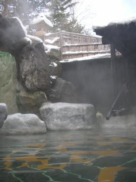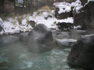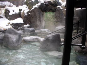 | 巨石が配されたいい露天風呂です。2つの湯舟のうち手前の方が熱めです。加水なしのかけ流しは奥の方、PH1.7の万代鉱は肌触りですぐわかります。万代鉱は高温ですが、上部から湯滝にして注ぎ込んでいるので温めになっているのでしょう。 |