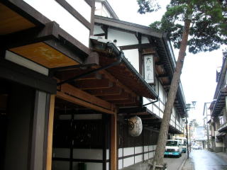 | 大阪屋は湯畑滝壺から続く滝下通りにあります。せがい出し梁り造りの街並みが美しい。右の写真、左側が大阪屋です。 |