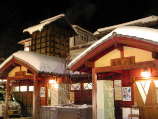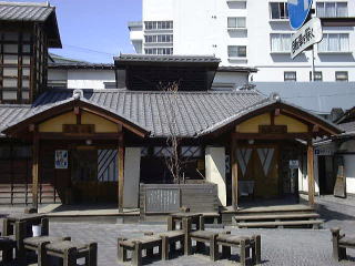 写真、向かって右側が女湯、左側が男湯の入口。男女とも熱めと温めの2つの湯舟がある。 |