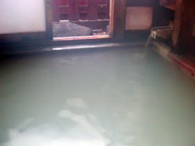 広い湯舟に湯量を絞って注いでいるので、白濁した湯を味わえます。