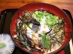 のは「冷やし山菜とろろおろし蕎麦」1,100円。ボリュームたっぷり、温泉玉子もトッピングされていて