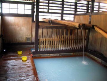 湯舟は男女とも2つずつ。大きい方の湯舟は10名ほどが入れる広さで、大きな木の樋からは新鮮な源泉がまさに滝となって注がれています。湯はやや熱めで青みがかった乳白色。