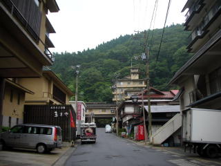 共同浴場・滝の湯はこの御神湯を使っています。右の写真の湯けむりが湧いているところが源泉。右上端に見えるのが滝の湯の屋根です。 |