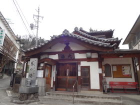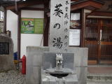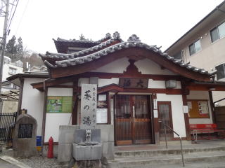| 大湯の名にふさわしく、湯屋造りに瓦屋根の堂々たる建物です。玄関脇には「葵の湯」の石碑と飲泉所があります。ほんのり玉子味の飲みやすい湯です。 |