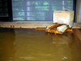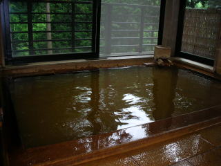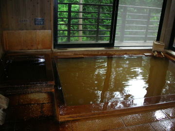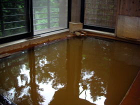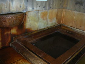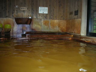 | 源泉は透明ですが加熱すると茶褐色になります。40℃くらいでしょうか。じっくり長湯できる温度です。 |