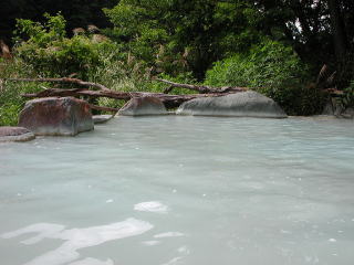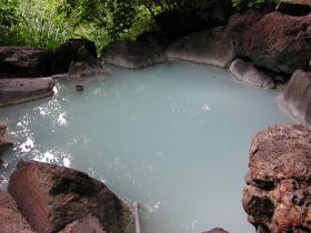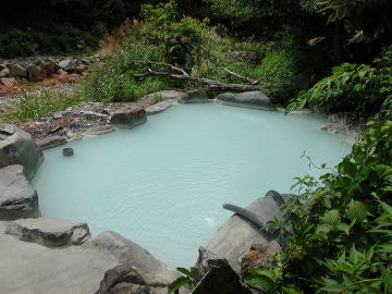 | 東邦大理学部の高松信樹教授によれば、ブルーから白への変化は硫黄コロイド(微粒子)が成長する過程での光の散乱によるもの。黒は降雨で源泉に松川の水が混入し、硫化鉄が生まれるためであろうとのことですが、緑色に濁る理由は未だに解明されていないそうです。 (参考:2004年「自由人10月号別冊」) |