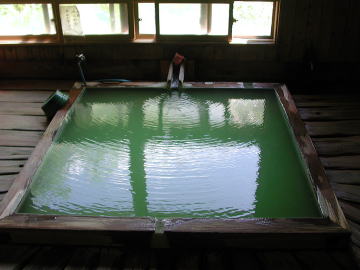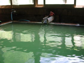 | いい雰囲気・・・こういう風情のある浴場は見るだけでも心が安らぎます。なんと檜の湯舟には緑色の湯が溢れています。同じ源泉でどうしてこうも色が違うのでしょう。 |
