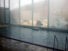 | 結構大きな内湯。沸かしの循環のようです。開放的なガラス張りで、湯気で曇っていなければさぞかしいい眺めでしょう。 |