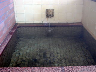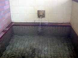 引き返そうかとも思いましたが、とりあえず2階に上がると管理人と思しき女性が食堂兼休憩所でテレビを見ていました。入浴に来たことを告げると、今日は露天風呂に湯を張っていないので500円のところを300円でいいとのこと。我々の他に客はいない様子。ラッキーのような、ちょっと寂しいようなで、入浴料を払って浴場へ。 |